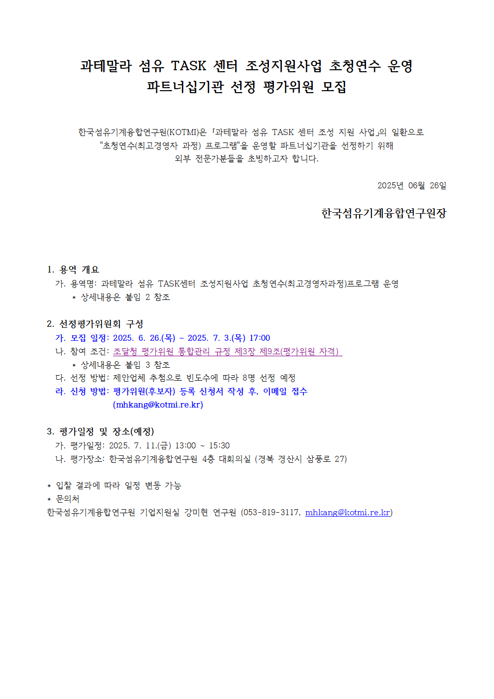 과테말라 섬유 TASK 센터 조성지원사업 초청연수 운영 파트너십기관 선정 평가위원 모집.pdf (50 kb)